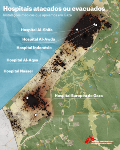 “A vida das pessoas está em risco por causa da falta de cuidados médicos. Com [o hospital] Nasser e o hospital Europeu de Gaza quase inacessíveis, não há mais um sistema de saúde em Gaza”, disse Guillemette Thomas, coordenadora-médica de MSF na Palestina. “Esses ataques sistemáticos contra os cuidados de saúde são inaceitáveis e devem terminar agora para que os feridos possam receber os cuidados de que precisam. Todo o sistema de saúde ficou inoperante.”