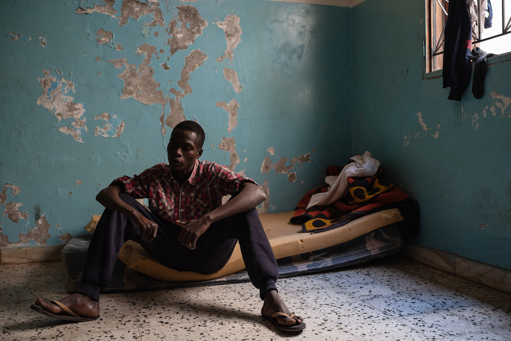 Já ouvi histórias semelhantes muitas vezes, especialmente nos bairros de Trípoli, onde refugiados e migrantes tentam levar uma vida normal. Gangues criminosas e milícias visam sistematicamente essas comunidades. Não há muito o que roubar, mas as pessoas costumam nos dizer que você pode ser morto até por causa de um celular. O medo é um sentimento comum. Osman compartilhou isso comigo na primeira vez que o conheci. Ele é um menino com um grande sorriso. Deixou a Somália por causa da guerra. Ele estava procurando um lugar mais seguro e decidiu viajar para a Europa. Mas na noite em que ele esperava para embarcar em um dos barcos que não podiam navegar em Trípoli, a polícia invadiu a casa do contrabandista. Eles perseguiram Osman e ele caiu do primeiro andar do edifício. Desde então, não consegue mais andar. Agora, ele está preso em um prédio abandonado em Gargaresh, em uma pequena sala escura que mais parece uma caverna. “Quando os ladrões chegam, todo mundo foge, mas tudo o que posso fazer é me esconder debaixo dos cobertores, esperando que eles não me vejam.”